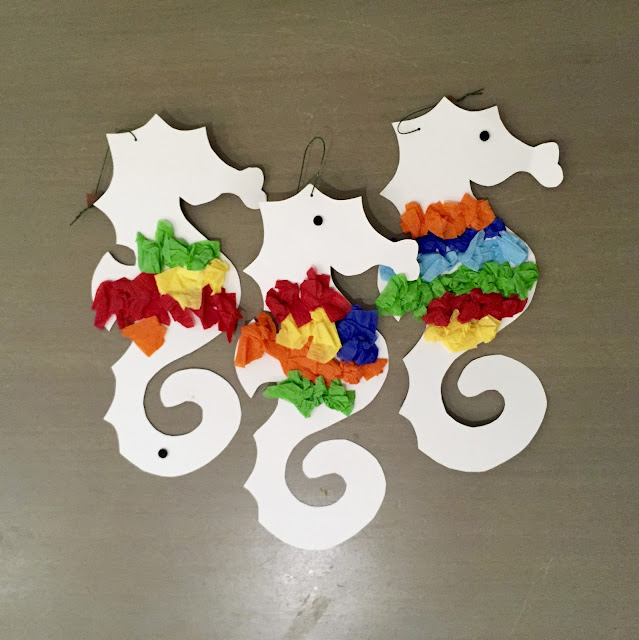 Manta Ray: acrylic paint, cardstock, and wiggly eyes. I like how simple these are, and the kids seemed to enjoy painting them with bubble wrap.